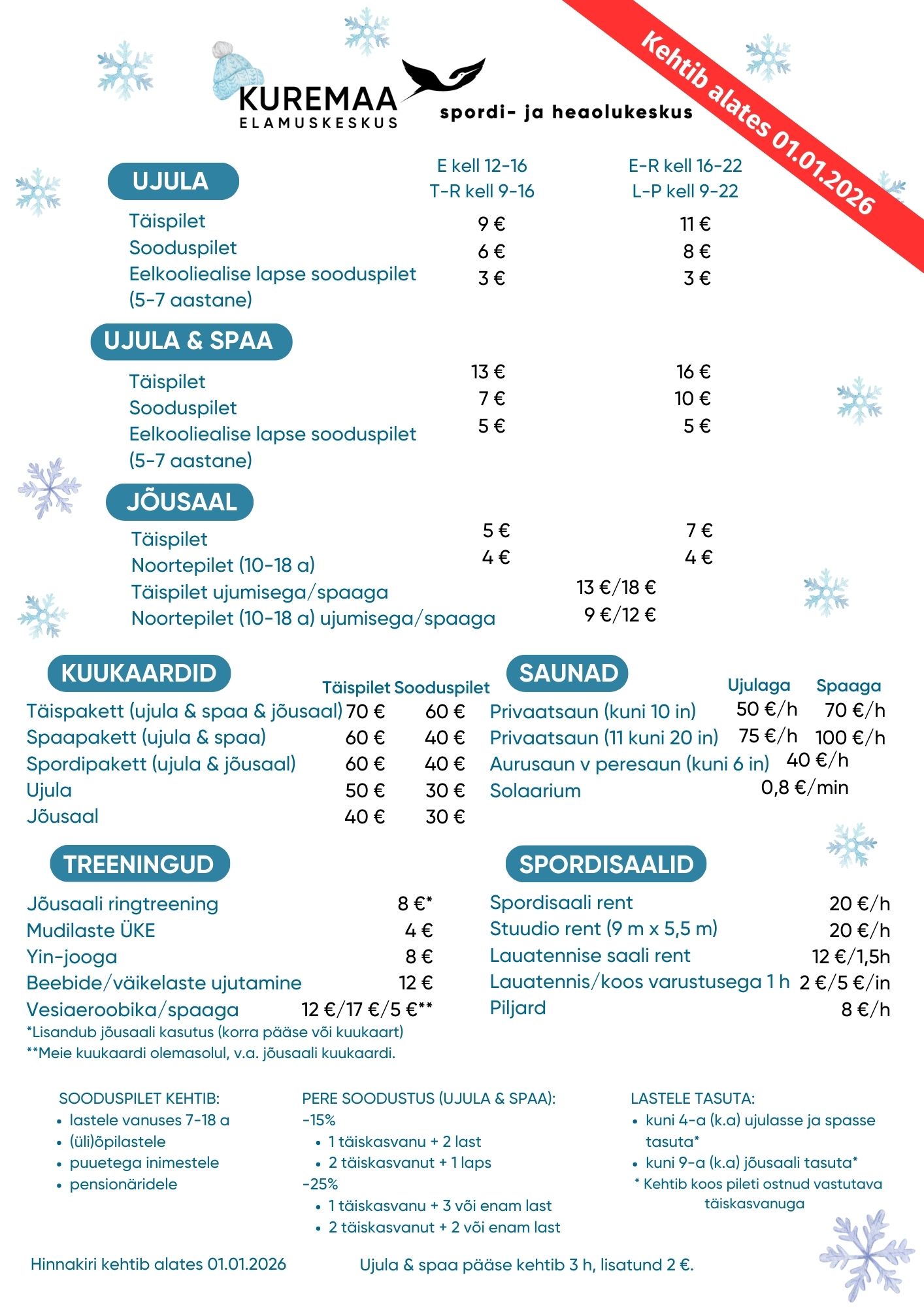 Kuremaa Elamuskeskuse hinnakiri 2026