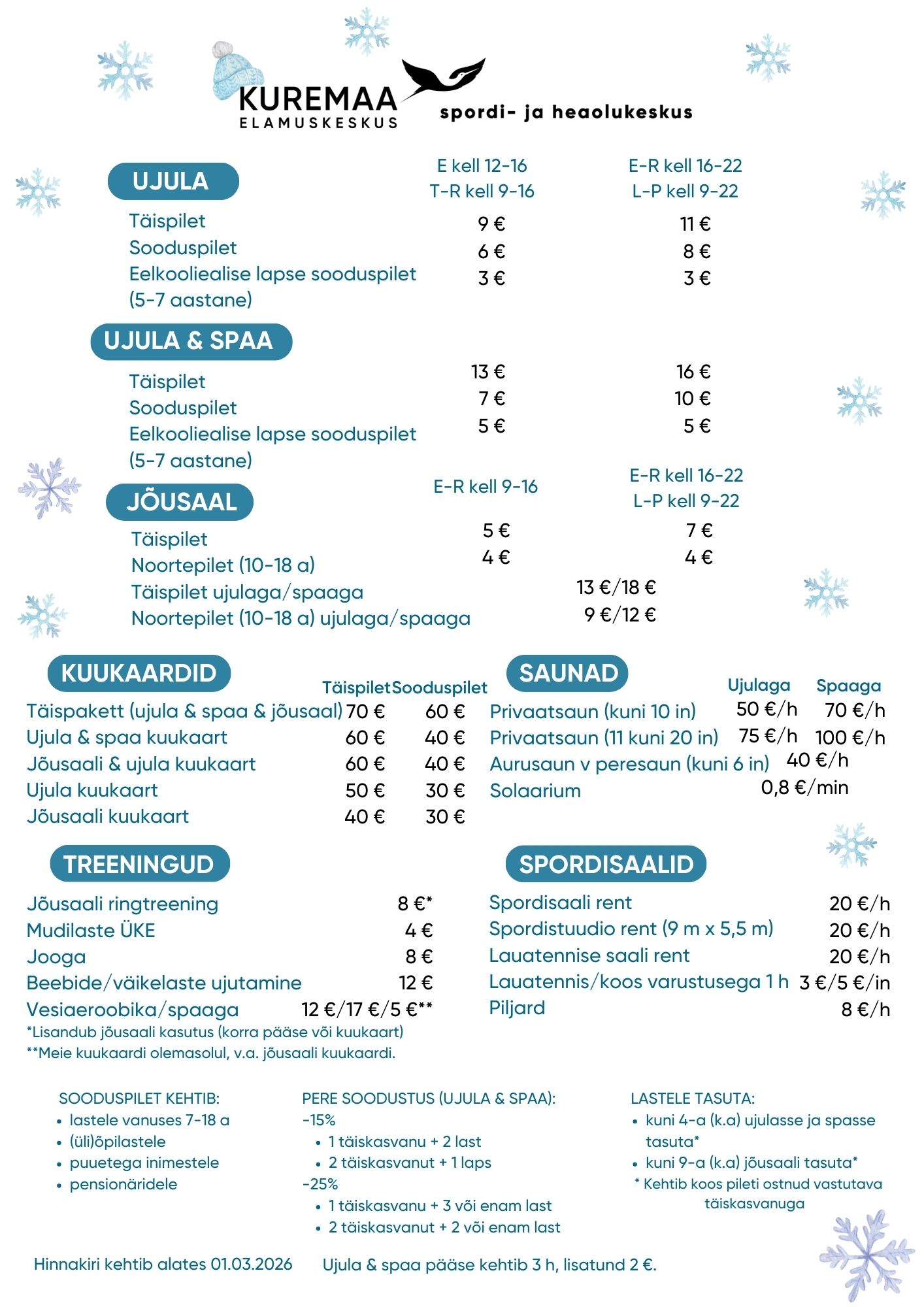 Kuremaa Elamuskeskuse hinnakiri 2026
